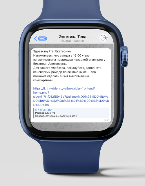 Отправляете клиенту привычное сообщение-напоминание накануне процедуры — добавьте в него ссылку на райдер. Клиент подтверждает запись и одновременно заполняет важную информацию перед визитом.